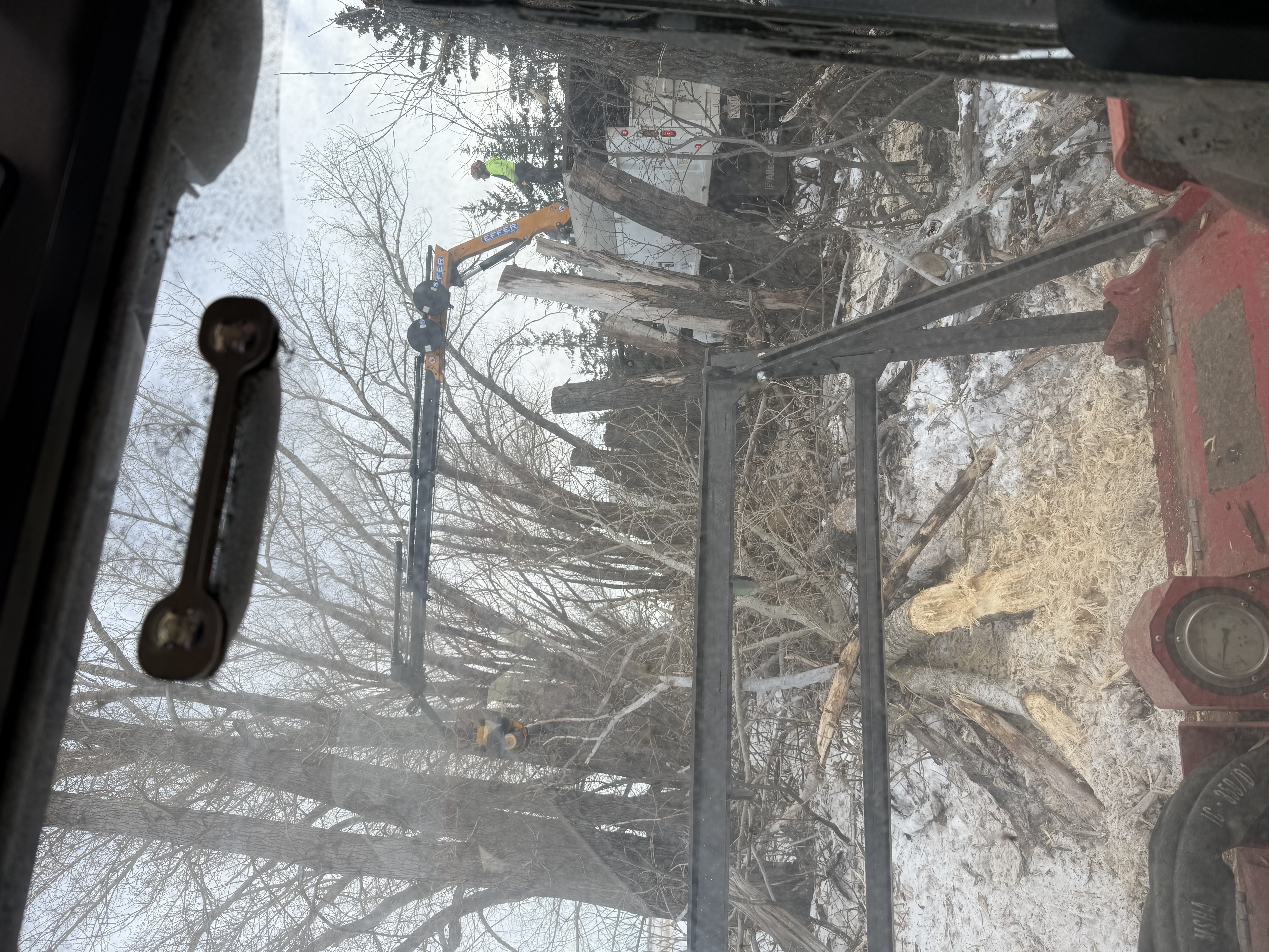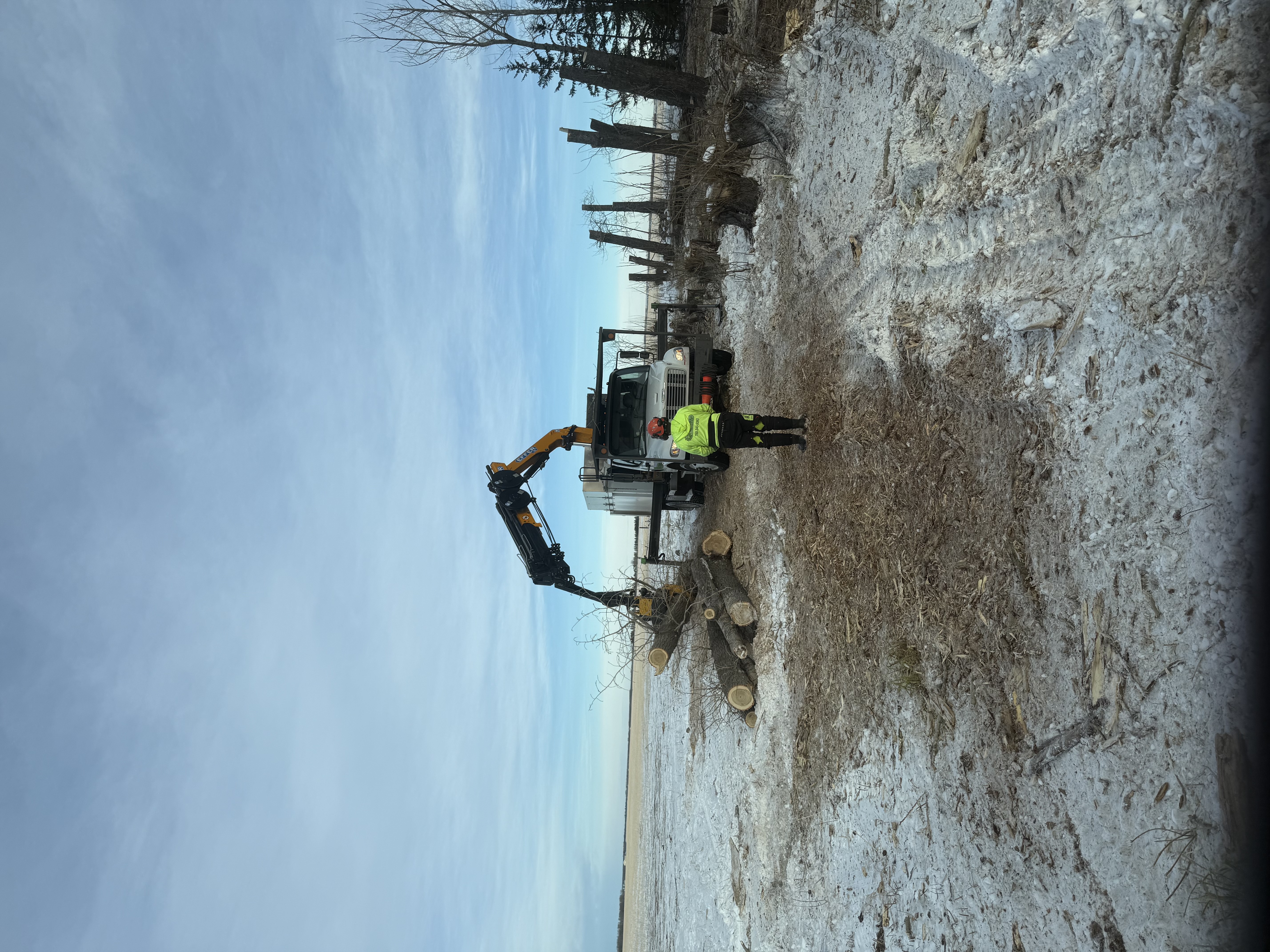 Specialized winter tree removal and property edge clearing completed using equipment-assisted handling for larger trees, tighter work areas, and cleanup near farm structures. These photos show practical Alberta tree removal and shelterbelt clearing work in real winter conditions.